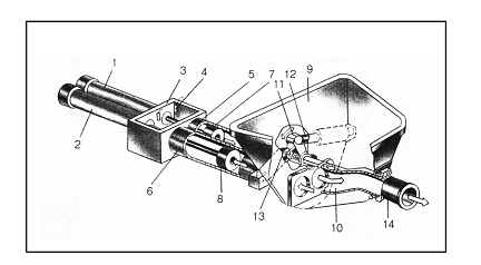 (1)(2)主油缸 (3)水箱 (4)換向裝置 (5)(6)混凝土缸 (7)(8)混凝土活塞 (9)料斗 (10)分配閥 (11)擺臂 (12)(13)擺動油缸 (14)出料口